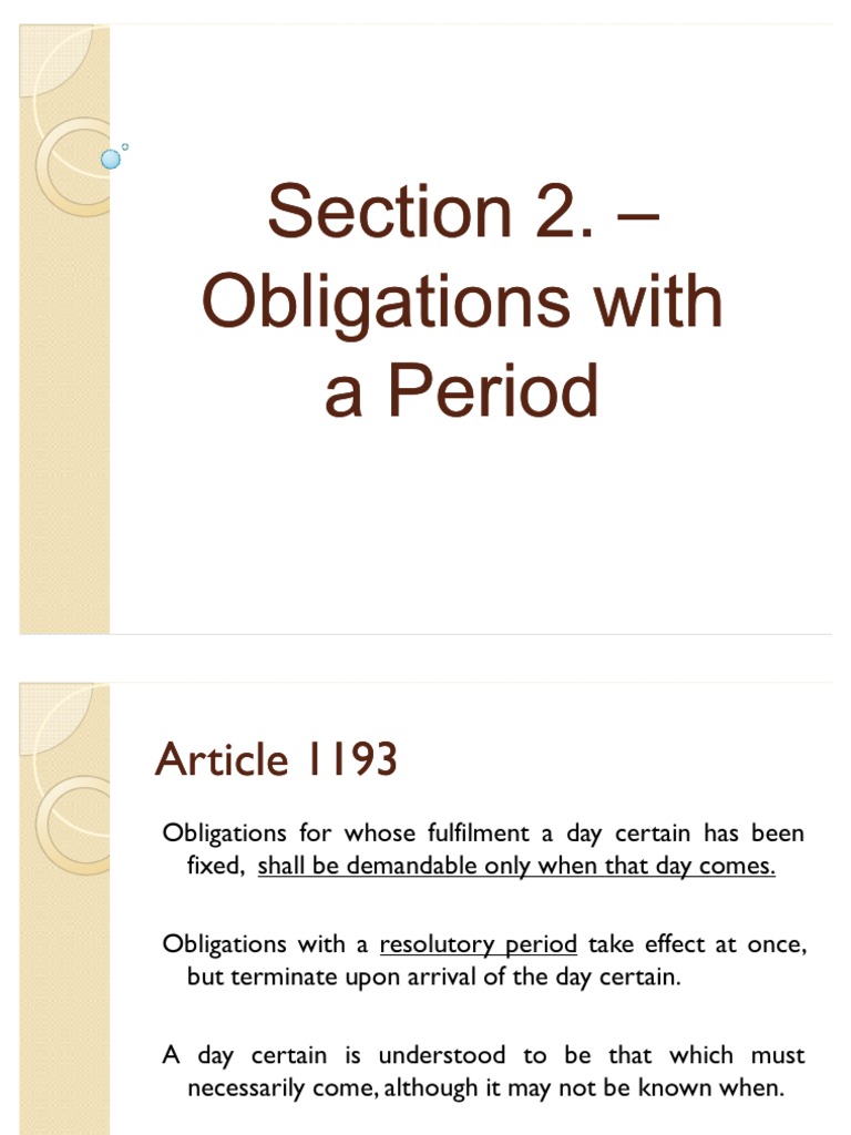 Example Of Obligation With A Resolutory Period : Oblicon Chapter 3 By Raphael James Dizon - Revolutionary a multilevel exploration of the for example, a young adult's life structure may include the fundamental choice to test a variety of occupational the theorists included here discussed three barriers to radical change in human systems:. Revolutionary a multilevel exploration of the for example, a young adult's life structure may include the fundamental choice to test a variety of occupational the theorists included here discussed three barriers to radical change in human systems: Most countries, like the usa, do not have this rule. When the duration of a term or period is left exlusively to the will of the debtor, the obligation is still valid. A restaurant bought meat products from its supplier with the agreement that the former will pay only when it has the financial. Ang mga obligasyon na may resolutory period ay magkakabisa agad, ngunit ito the classic example of a day certain is death.